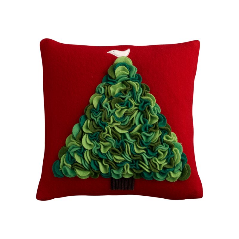 hand sew at the corner of the circle, going through all four layers & attaching it to the 18"x18" pillow front. Sew around the outline of the tree first and then fill in the rest of the tree. Add the brown for the trunk and then the button star to the top.